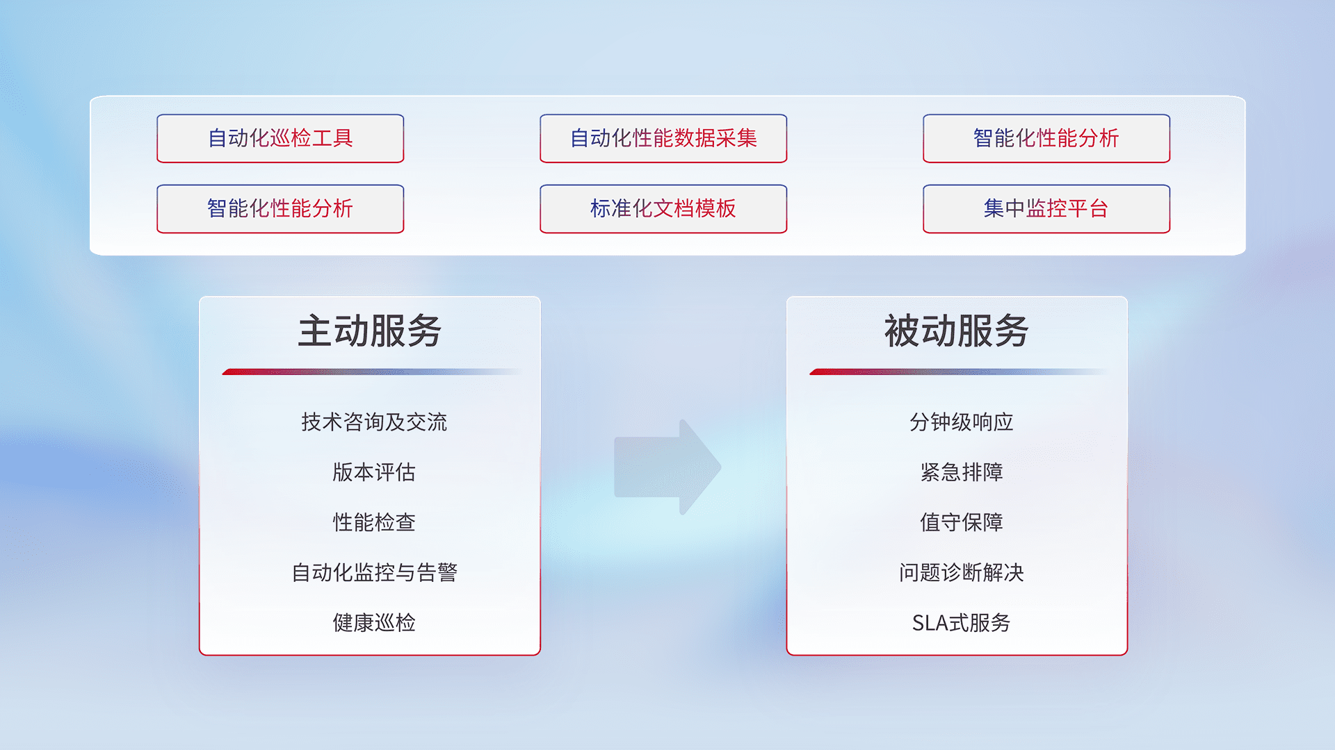 智能化工具和标准化文档,,,,保障服务质量,,,提供主动服务(包含技术咨询、、版本评估、、、、性能检查、、、自动化监控与告警、、、、健康巡检)和被动服务包含(分钟级响应、、紧急排障、、、、值守保障、、、、问题诊断解决、、、、SLA服务)。。。。